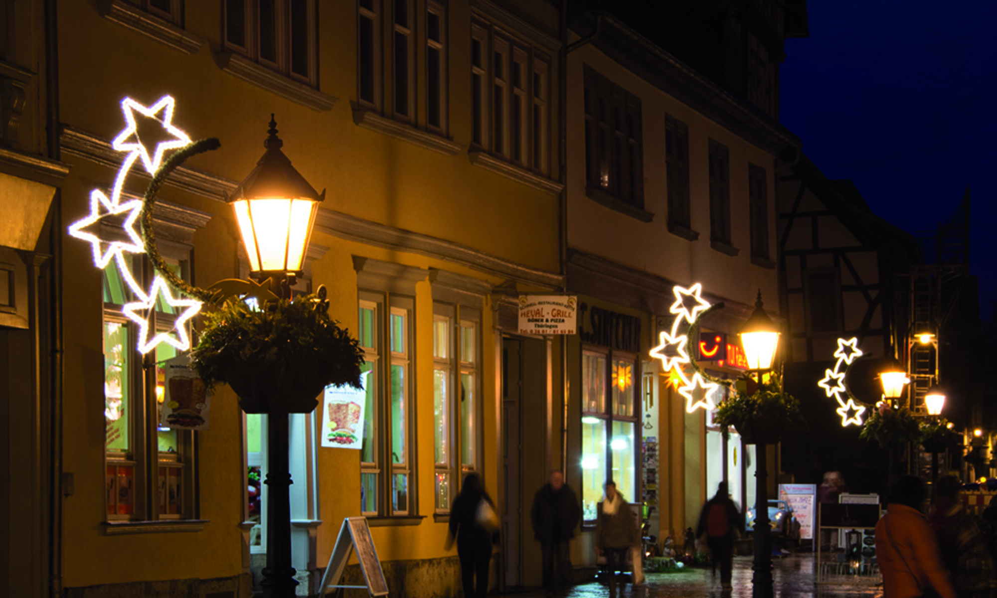 Motive mit LED rope light und grünen Girlanden verbinden bei der clear outlines. die moderne Beleuchtung mit dem Traditionellen. Die hochwertigen Motive eignen sich für Straßenüberspannungen, Straßenlaternen und Hauswände. Grüne Luvi-Girlanden lassen die Beleuchtung üppig erscheinen und sichern eine optimale Tageswirkung. Gleichzeitig stehen sie für Gemütlichkeit und Tradition. Auch Kombinationen mit LED string lights sowie mit LED 3D Dekoration sind hierbei möglich.